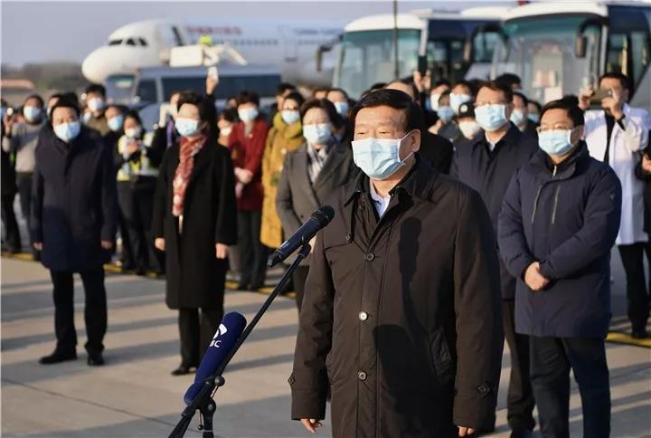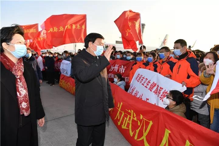 在南京禄口机场,江苏省委书记娄勤俭为医疗队队员壮行,并深情寄语:“我们八千万江苏人民等着你们,等着迎接出征的勇士全部平安凯旋!我们是保障者,我们是同行军,我们一路同行!”