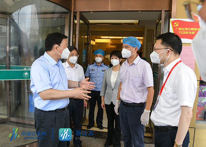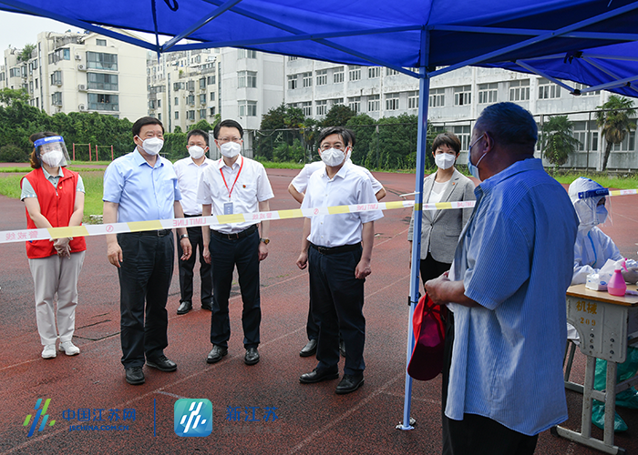 在扬州技师学院核酸检测采样点,娄勤俭向等候检测的居民了解核酸检测情况。