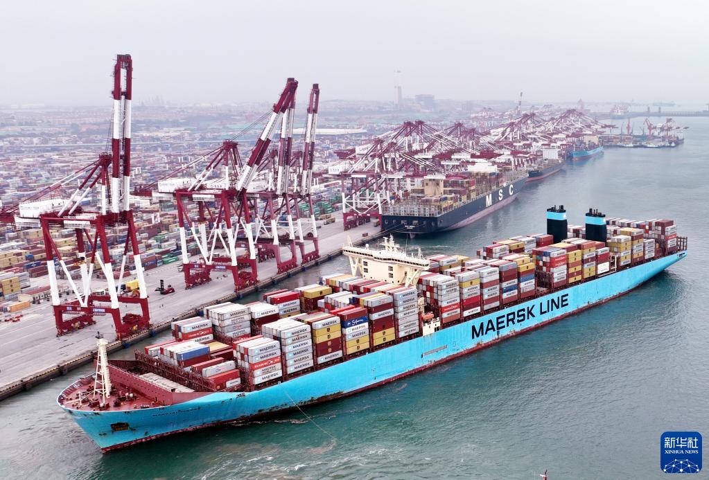 在山东港口青岛港前湾码头,欧洲贸易航线的“美途马士基”集装箱货轮解缆起航(2022年7月29日摄,无人机照片)。新华社记者李紫恒摄