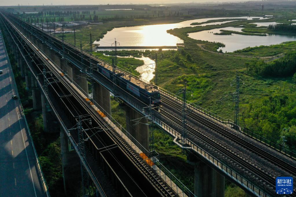 重载列车行驶在大秦铁路上(2022年7月16日摄,无人机照片)。为做好迎峰度夏能源保供工作,中国铁路太原局集团有限公司在确保运输安全的前提下全力提升煤炭运量。新华社记者曹阳摄