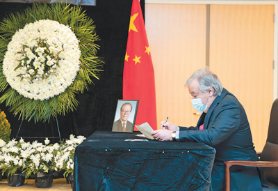 十二月五日,联合国秘书长古特雷斯在中国常驻联合国代表团驻地吊唁江泽民同志。新华社记者王迎摄