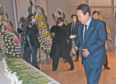 12月2日,韩国总统尹锡悦在中国驻韩国大使馆吊唁江泽民同志。李相浩摄(新华社发)