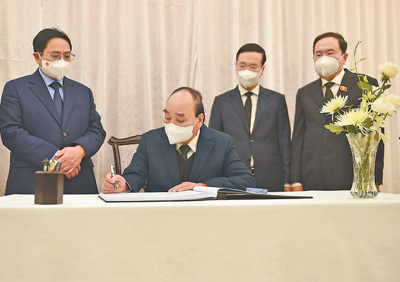 12月2日,越南国家主席阮春福(左二)、总理范明政(左一)等在中国驻越南大使馆吊唁江泽民同志。新华社记者胡佳丽摄