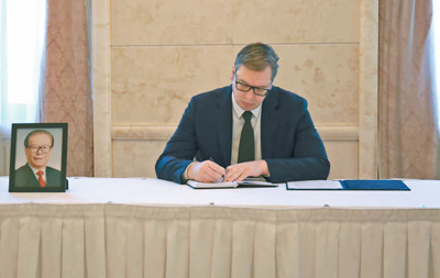 12月3日,塞尔维亚总统武契奇在中国驻塞尔维亚大使馆吊唁江泽民同志。中国驻塞尔维亚大使馆供图(新华社发)