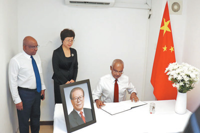 12月5日,马尔代夫总统萨利赫(右)在中国驻马尔代夫大使馆吊唁江泽民同志。中国驻马尔代夫大使馆供图(新华社发)