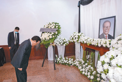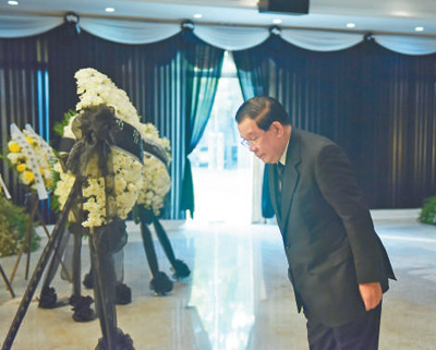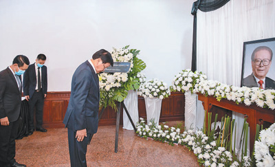12月5日,柬埔寨首相洪森在中国驻柬埔寨大使馆吊唁江泽民同志。万坡摄(新华社发)