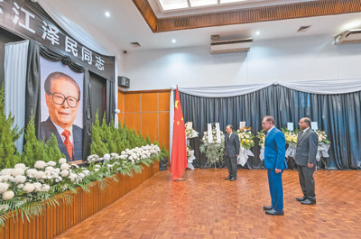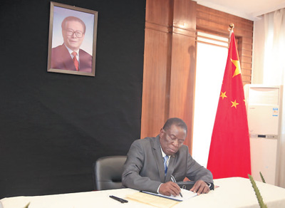 十二月五日,津巴布韦总统姆南加古瓦在中国驻津巴布韦大使馆吊唁江泽民同志。肖恩·朱萨摄(新华社发)