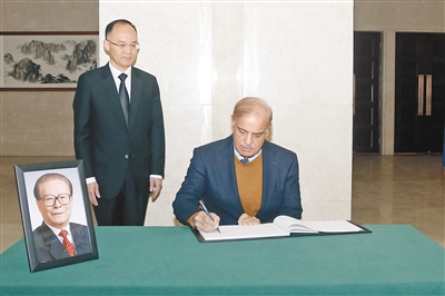 12月1日,巴基斯坦总理夏巴兹在中国驻巴基斯坦大使馆吊唁江泽民同志。艾哈迈德·卡迈勒摄(新华社发)