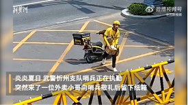 2、外卖小哥向哨兵敬礼后留下一箱雪糕近日,在山西忻州,武警忻州支队哨兵正在执勤,突然来了一位外卖小哥,向哨兵敬礼后放下一个纸箱,哨兵见状立刻回礼并上前查看,打开发现是满满一箱雪糕。(@河畔视频)