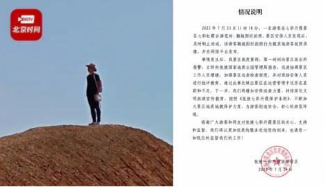 2、游客翻围栏踩踏丹霞地貌拍照,官方通报23日,网传一游客从甘肃张掖七彩丹霞景区七彩虹霞台低矮处翻越围栏拍照引发热议。24日,张掖国家地质公园管理局通报,该游客被景区安保人员及时发现后劝返。丹霞景区派出所已联系到当事人,其认识到自己行为的错误性、严重性,诚恳道歉。相关部门将依据条例对当事人进行处理。(央视新闻)