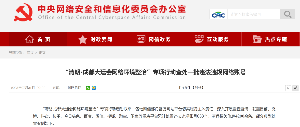 中央网信办通报了部分典型处置案例,包括传播大运会谣言信息、利用“伪公益”恶意营销炒作、假冒仿冒账号发布信息、发布涉大运会违规售卖信息等。