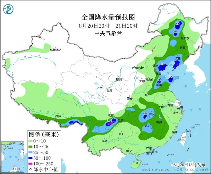 8月20日20时至21日20时,黑龙江西南部、吉林西部、辽宁中南部、河北东部、北京东部、天津、山东北部、湖北东南部、湖南中北部、四川南部、重庆西南部、云南北部、西藏东南部等地部分地区有大到暴雨,其中,四川东南部、云南东北部等地局部大暴雨。