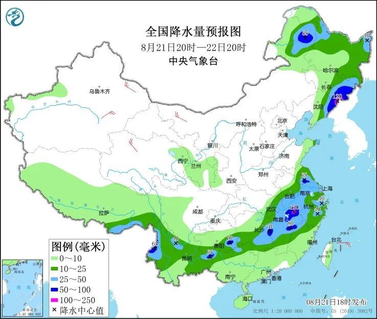 8月21日20时至22日20时,内蒙古东北部、黑龙江西部、吉林中东部、辽宁东部、江苏中部、安徽中南部、浙江、江西中北部、湖北东部、湖南中部、贵州南部、云南西北部和东部等地部分地区有大到暴雨,其中,吉林东南部和江西东北部等地局地有大暴雨。
