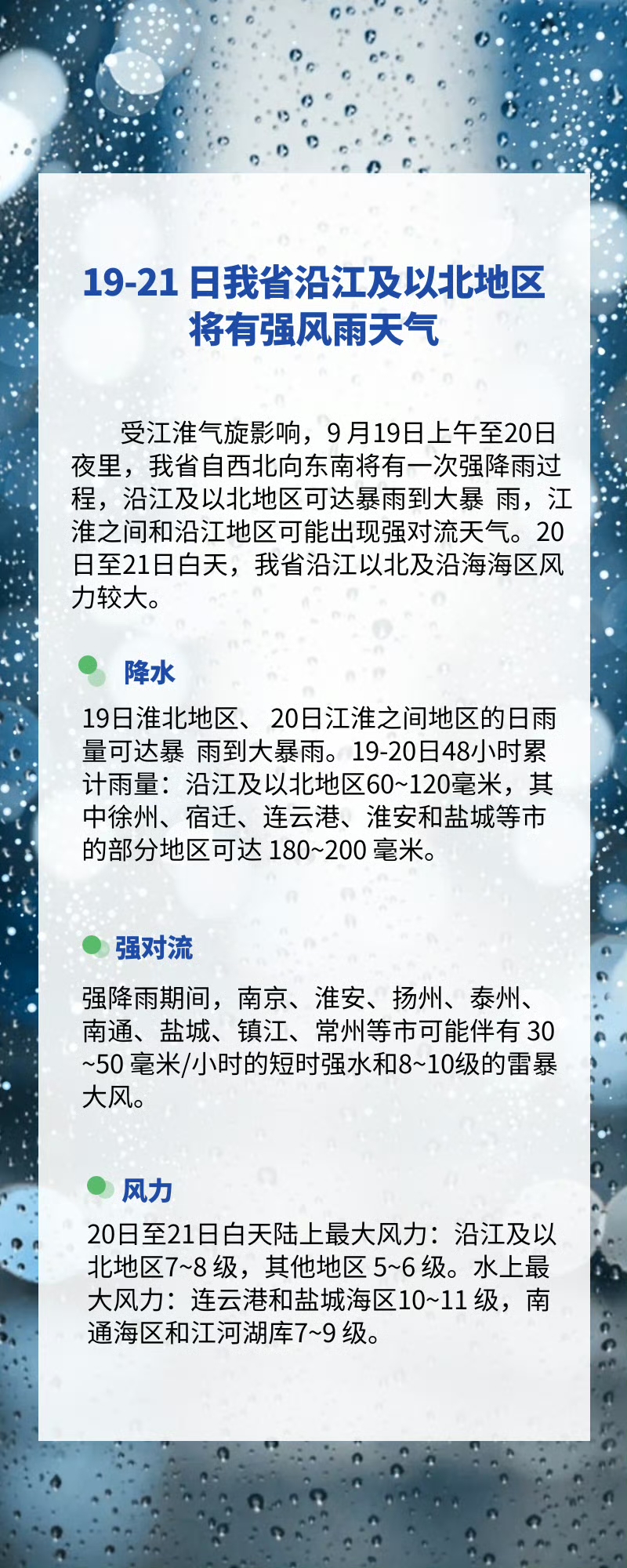 强降雨期间,南京、淮安、扬州、泰州、南通、盐城、镇江、常州等市可能伴有30~50毫米/小时的短时强水和8~10级的雷暴大风。20日至21日白天陆上最大风力:沿江及以北地区7~8级,其他地区5~6级。水上最大风力:连云港和盐城海区10~11级,南通海区和江河湖库7~9级。