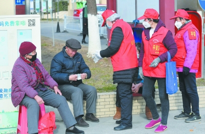 昨天天气晴好,不少居民走出家门,散步透风,三三两两聚在一起聊天。雨花台区板桥新城的“汪姐志愿者服务队”队员们走上街头,劝导居民不聚集,戴口罩,减少疫情交叉感染的可能性。 通讯员 蒋丽媛 南报融媒体记者 冯芃摄