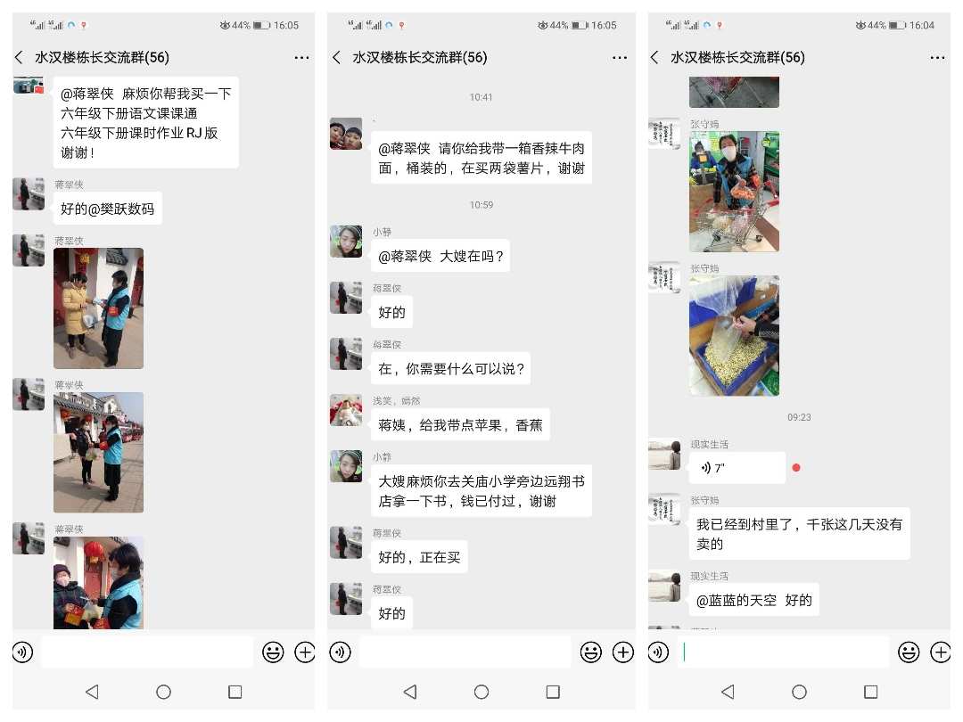 水汉新村幸福家园小区,包含住户156户,常驻人口724人,网格员变身楼栋长,疫情防控期间,他们尽心尽职,每天在微信群询问生活上有什么需要,每天几次巡查卫生及消毒情况。为防止疫情继续蔓延,水汉社区人员全部自我居家隔离。为保证居民的正常生活需求,两名网格员变身“外卖员”,亲自去超市里买菜并且每天两次为居民送菜上门。