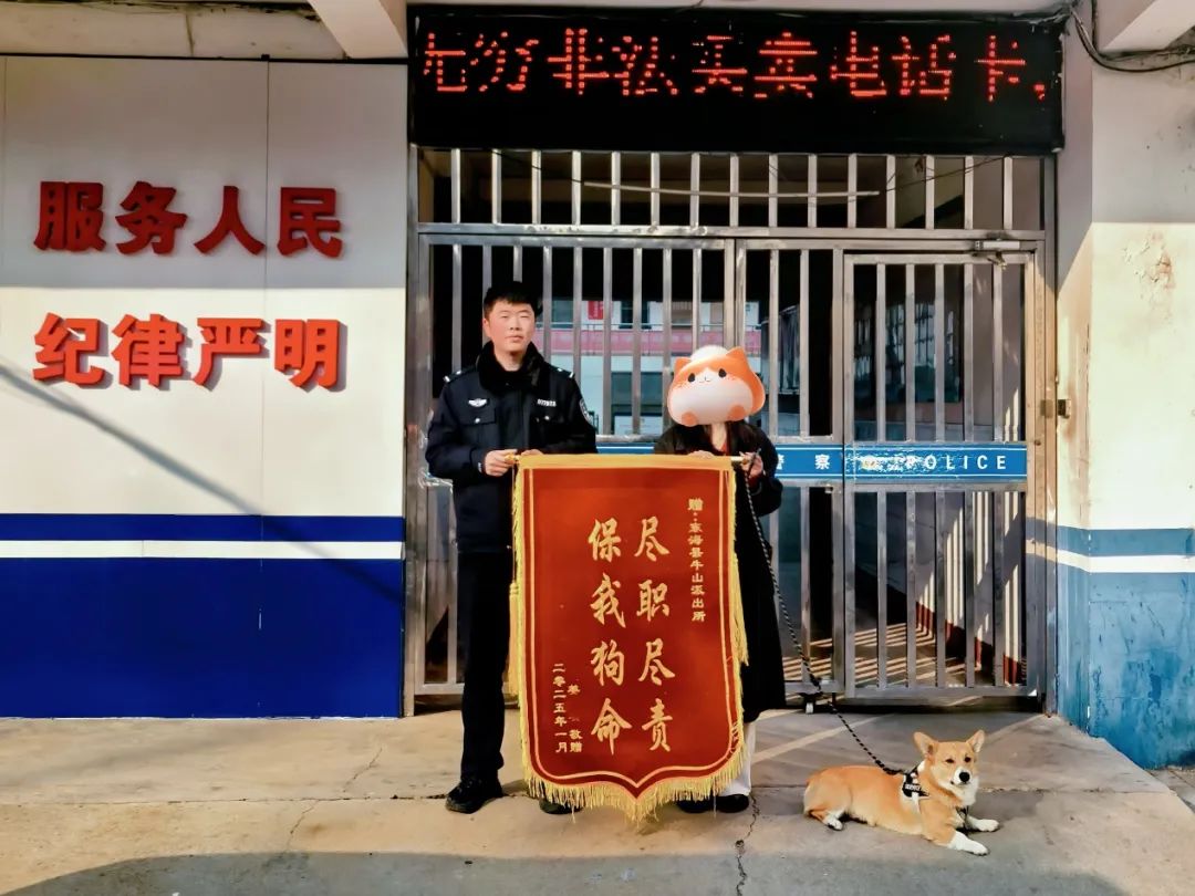 1月19日一大早,家住东海县牛山街道的市民姜女士带着一面锦旗来到牛山派出所。民警李坤泽打开锦旗的瞬间笑了起来。原来,这面金灿灿的锦旗上面印着“尽职尽责,保我狗命”,8个大字十分显眼。