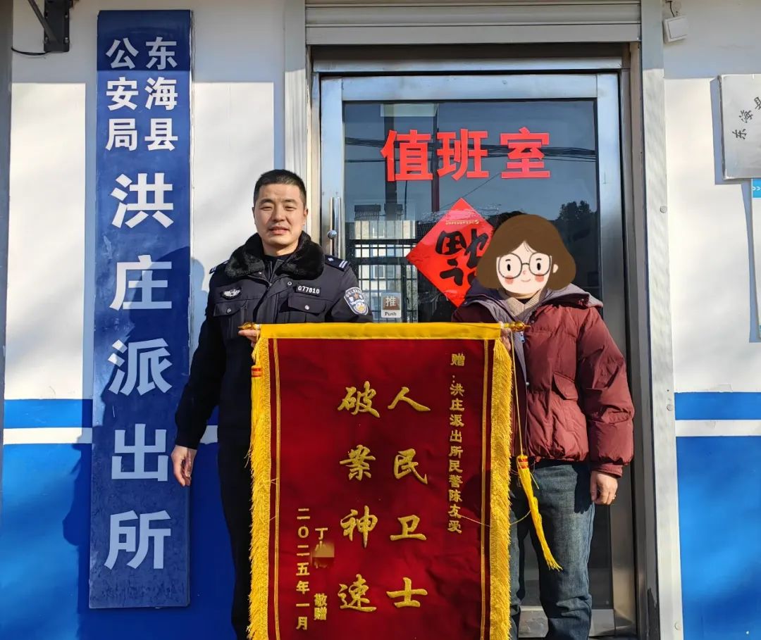 1月28日大年三十上午,东海县公安局洪庄派出所民警收到了一份特殊的“新春大礼”,家住东海县洪庄镇的市民丁女士一家三口兴高采烈地来到派出所,将一面印有“破案神速 人民卫士”的锦旗和感谢信交到民警陈友爱手中,感谢民警将其辛苦攒下的10万元血汗钱追回,让其全家过上一个幸福祥和的春节。