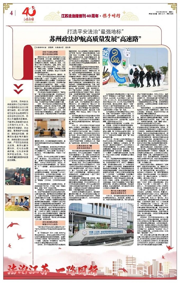 近年来,苏州政法系统坚持以习近平新时代中国特色社会主义思想为指导,深入学习贯彻习近平法治思想和习近平总书记对江苏、苏州工作重要讲话精神,不断深化改革提升政法工作现代化水平,扎实推进平安建设、法治建设,聚焦维护社会稳定、服务经济发展、保障民生福祉等关键任务,持续加强社会治理创新,严厉打击各类违法犯罪,高效化解矛盾纠纷,优化法治营商环境,以扎实举措筑牢安全防线,为全市高质量发展提供坚强政法保障。